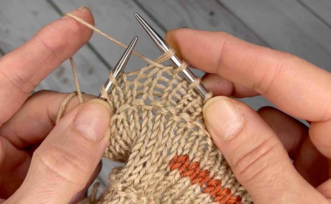 2.2 Снова провязываем петли ряда до разворота и делаем второй накид. Когда необходимое количество разворотов будет сделано, скидываем накиды на левую спицу и провязываем их вместе со следующей лицевой (или изнаночной, следуя логике ряда) так, чтобы накид оказался позади основной петли ряда.