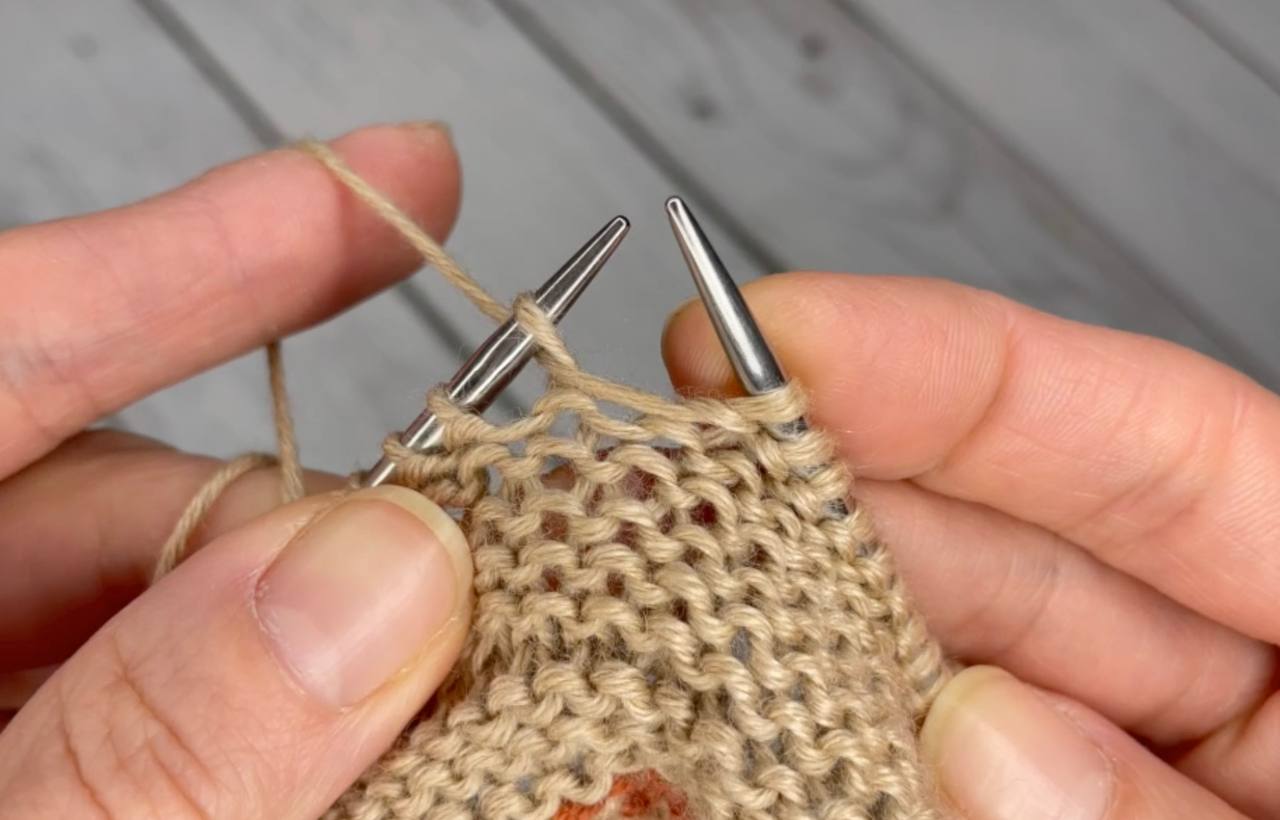3.1 Провязываем петли лицевого ряда до места разворота, выводим рабочую нить перед работой, снимаем петлю с левой спицы на правую не провязанной и нить снова заводим за работу, петлю возвращаем на левую спицу.